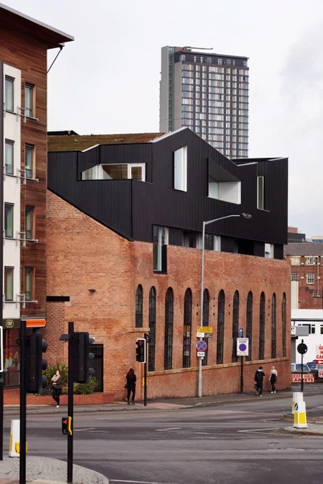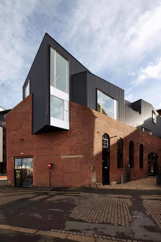 是否熟悉,邊肖上一期介紹了類似這樣的建筑。這座建筑建在維多利亞時代的一座古老工業(yè)磚建筑上。新的黑色鋁板屋頂穿過原建筑的外殼,堪稱古老與現(xiàn)代的完美結合。兩個時代的建筑再次碰撞。